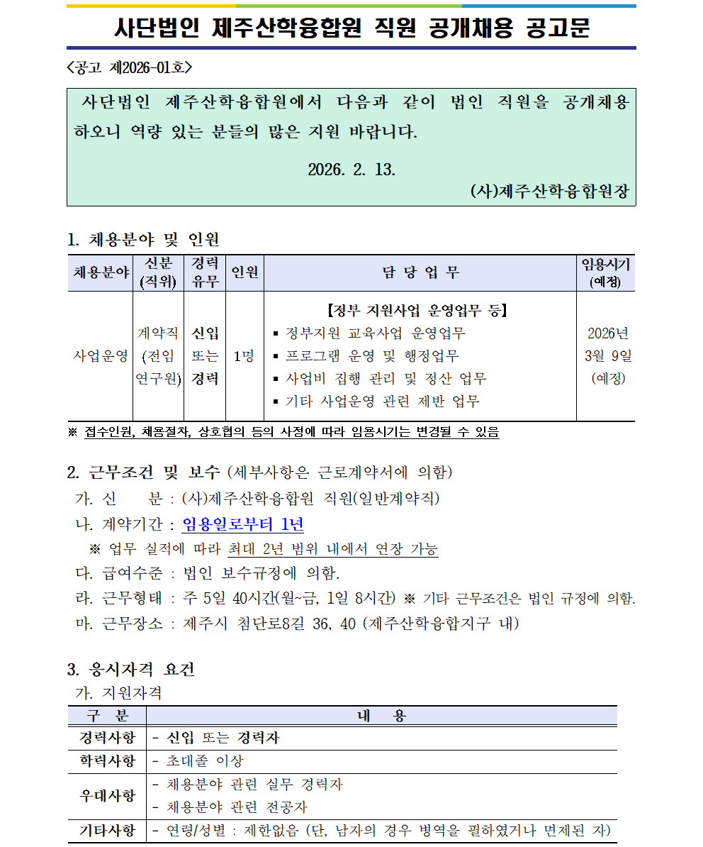 첨부파일 #4. 2026년 사단법인 제주산학융합원 직원 공개채용 공고문.pdf